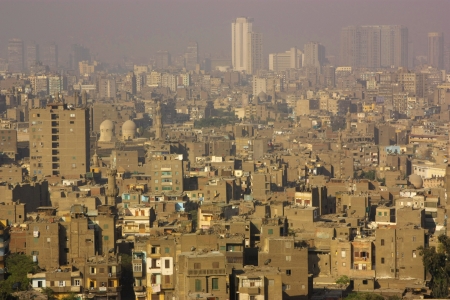 Aerial view of the city of Cairo with densely packed residential homes and buildings