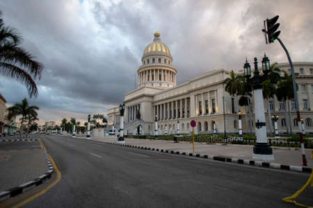 Beautiful view of El Capitolio in the Old Havana City, Capital of Cuba, during a vibrant cloudy day.
