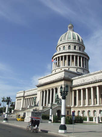 Havana's Capitol and a bycicle taxi, in a sunny day