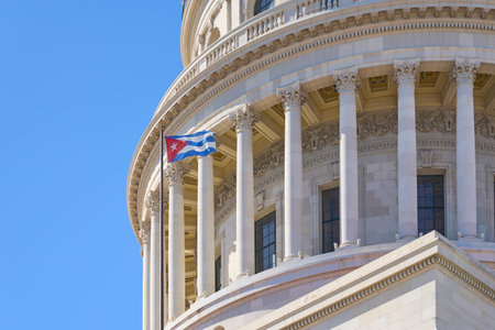 The dome of the Capitol in Havana with flag of Cuba against the backdrop of a clear blue sky.