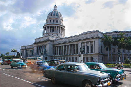 Traffic in avenue in front of the Capitol of Havana, one of the most visited areas in the city by tourists. Havana Cuba. January 2, 2019