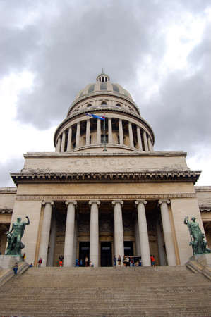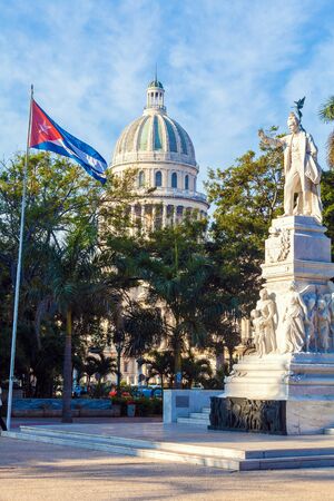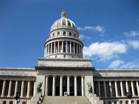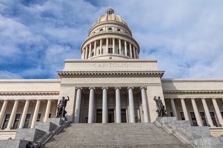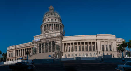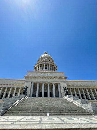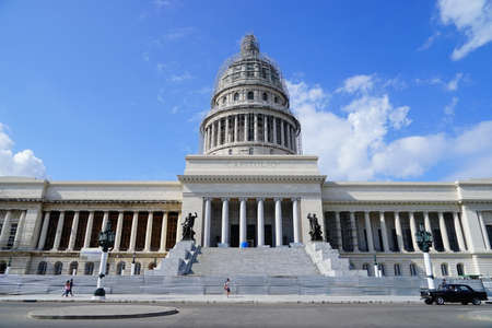 Cuba Capitolio. Neoclassical capitol building in Havana. Grand dome, stone columns, stairs and statues, low angle view. Sunny day, clear blue sky
