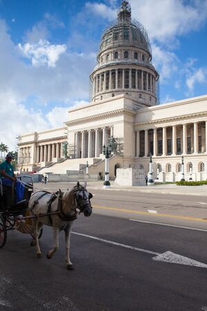 Havana, Cuba. January 2018. A of a horse against the Capitolio building in Central havana in Cuba