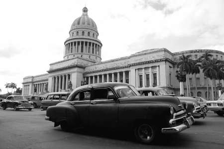 HAVANA, CUBA - February 10, 2014: Old cars in front of the capitol on February 10, 2014 in Havana, Cuba. The capitol is the town's landmark.