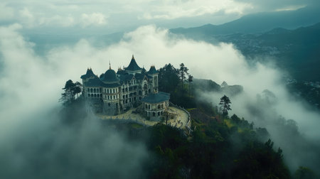Explore a stunning aerial view of a majestic castle enveloped in misty clouds, nestled among lush mountains, creating a serene and enchanting atmosphere.