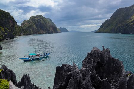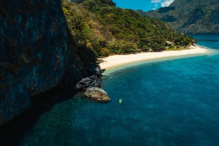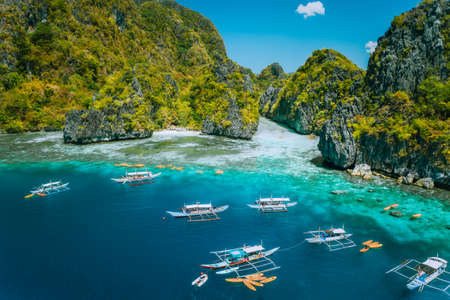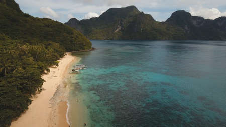 Beautiful beach with boats and tourists. Tropical bay in El Nido. Aerial view: bay and the tropical island. Tropical lagoon with turquoise water and white sand. Seascape: mountains, ocean. Sky and mountains rocks. Philippines, El Nido. Travel concept.