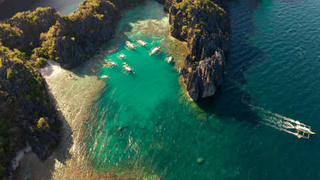 Tourist boats over tropical lagoon and coral reef, aerial view. Small lagoon with turquoise water. El nido, Philippines, Palawan. Summer and travel vacation concept.