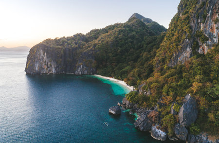 Sunset top down of hilly tropical island at ocean gulf in aerial view. Amazing sun set light at tropical forest on Palawan Isle, Philippines. Dramatic dark blue seascape at soft light drone shot