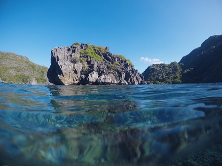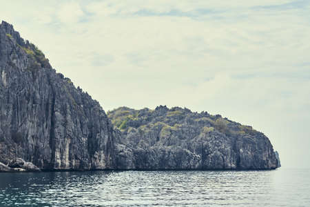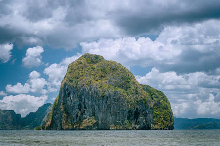 Tropical island landscape with sea and rock formation. Unusual tropical seaside landscape with mountains in sea. Abandoned rocky islands near Palawan, the Philippines. Volcanic island with greenery