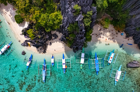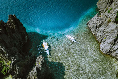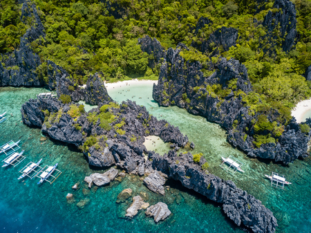 Aerial shot of the Philippines islands in Palawan. Banca boats in the morning shallow water neat to the rocks