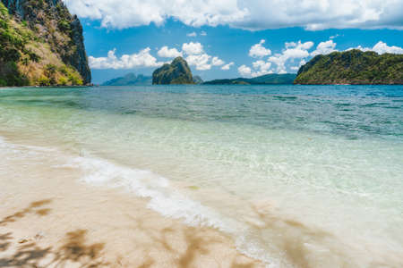 Seascape with tropical islands. El Nido Palawan National Park Philippines. Rocky islands covered with forest. Small lagoons with white beaches. Boat tours between the islands.