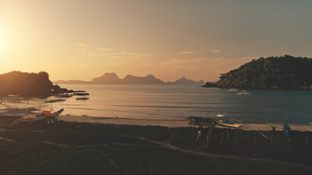 Green mountains at sun sea bay with boats aerial. Tropic paradise islet at sand beach. Passenger ships and vessels on ocean coast. Summer vacation at El Nido Island, Philippines, Asia