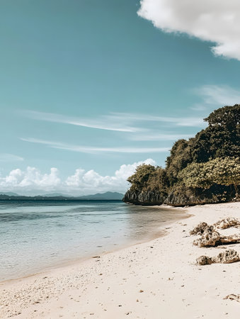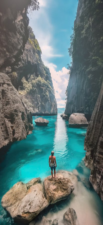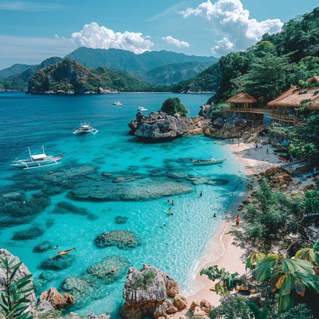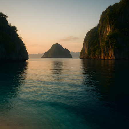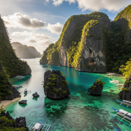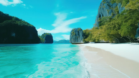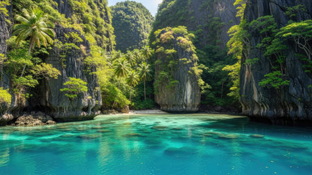 A vibrant image presents a serene tropical lagoon. The scene showcases clear turquoise waters reflecting sunlight. Towering cliffs, covered in lush green vegetation, frame the water. The composition highlights a sense of natural beauty. Suitable for travel publications and environmental projects, it offers versatile applications.
