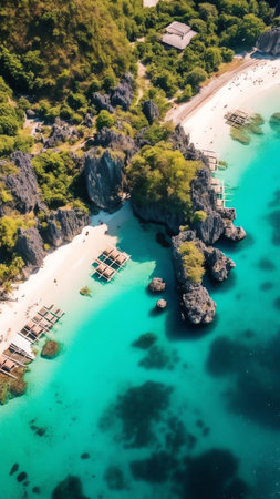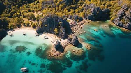 Generative AI : Aerial view of a many Catamaran boats along Coron Island coastline Bayan ng Coron Palawan Philippines