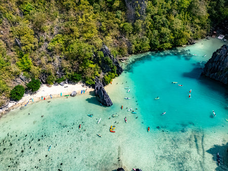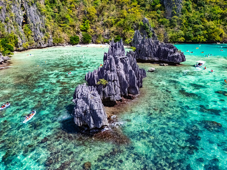 El Nido, Palawan, Philippines, aerial view of beautiful big lagoon, limestone cliffs and kayaking tourists