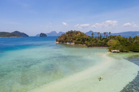Aerial view: beach, tropical island, sea bay and lagoon, Palawan. Lagoon with blue, azure water in the middle of small islands and rocks. Busuanga. Seascape, tropical landscape. Philippines.