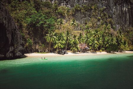 El Nido, Palawan, Philippines. Unknown star beach with overnight accommodations. Beautiful shallow ocean lagoon and exotic plants