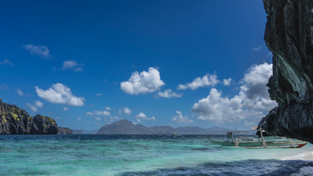The traditional Filipino bangka boat is moored off the shore of the aquamarine ocean. A sheer cliff in the foreground. Mountains in the distance against the blue sky and clouds.