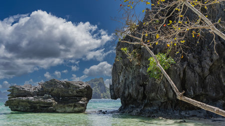 Picturesque cliffs in the ocean. Steep cracked slopes above turquoise water. Blue sky, clouds. There are tree branches in the foreground. Philippines. Palawan. El Nido.
