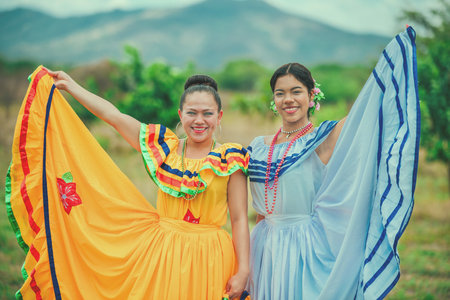 Portrait of two Hispanic women wearing cultural folkloric costume in a field. Two smiling Hispanic girls wearing cultural folkloric costumes outdoors