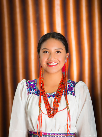 OTAVALO, ECUADOR, NOVEMBER 06, 2018: Portrait of indigenous woman wearing andean traditional clothing and necklace posing for camera
