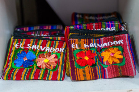 Colorful hand-woven purses from El Salvador, with embroidered flowers and the name of the country.