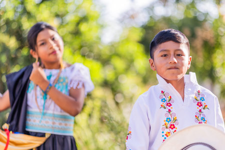 Hispanic children wearing cayambe dance traditional clothes celebrating national festivity.