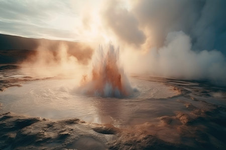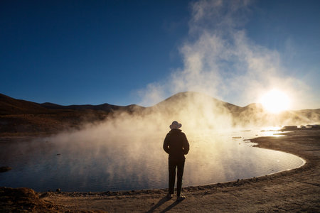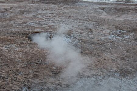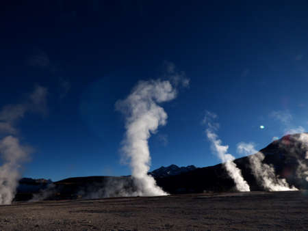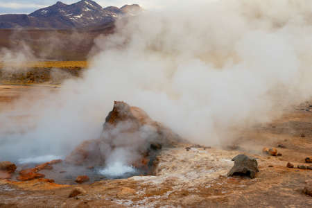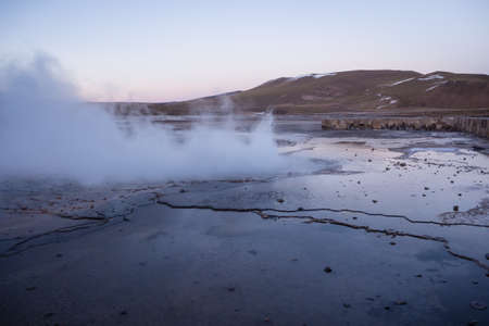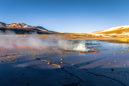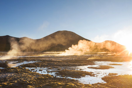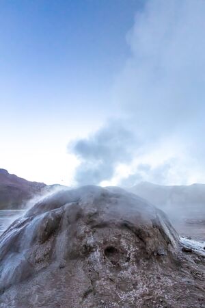 Steam of one of the beautiful El Tatio geysers at sunrise, Chile. Located at 4,320 meters above the sea level El Tatio geyser valley is one the highest elevated geyser field in the world.
