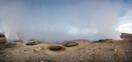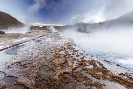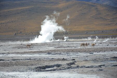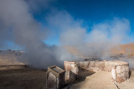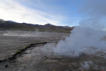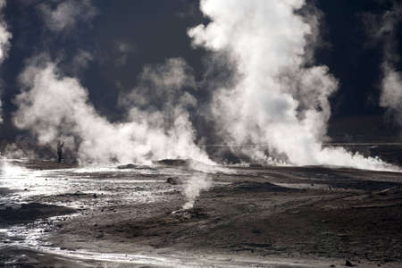 Beautiful Landscape of Geysers throwing steam columns. . Taken during the sunrise at 4261.6 msm altitude at Geysers of Tatio at San Pedro de Atacama - Guatin - Linzor, Calama in Antofagasta region (CHILE)