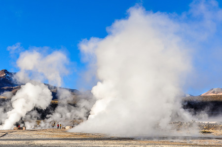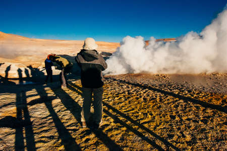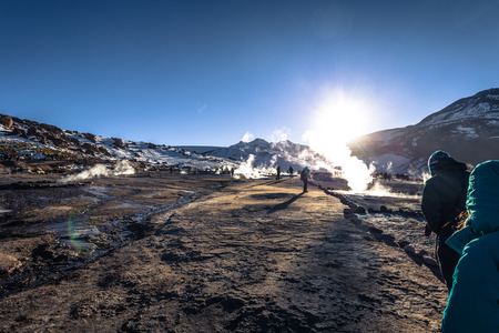 Atacama Desert, Chile - Travelers in the El Tatio geysers in the Atacama Desert, Chile