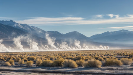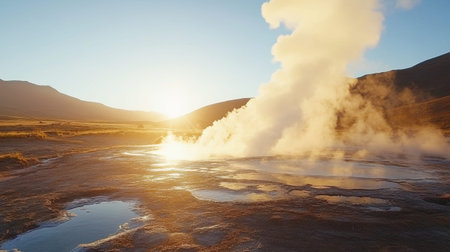 A breathtaking display of steam rising from geothermal springs at sunrise, set against a stunning desert landscape featuring distant mountains and clear skies.