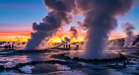 Silhouetted figures at sunrise amidst majestic geyser fumaroles in a stunning landscape