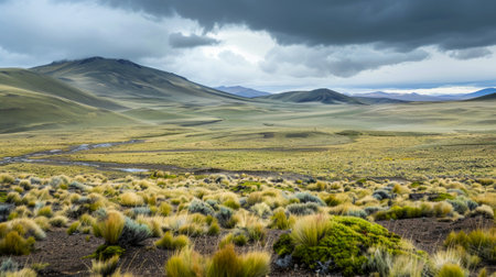 Vast landscape of green hills and dramatic cloudy sky. Concept of nature, wilderness, scenic view, tranquility.