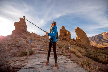 Young female traveler making selfie with small action camera on a stick on the beautiful rocky background in Teide park on Tenerife island