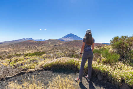 Young woman enjoying view on volcano Teide on Tenerife island, Spain.