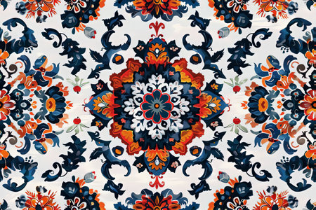 A detailed and colorful geometric pattern with star and floral motifs in blue, gold, and terracotta, displaying intricate symmetry and ornate