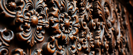 A close-up of an intricate decorative carving showcasing detailed floral patterns and swirls in a monochrome palette. Ideal for art or design themes.