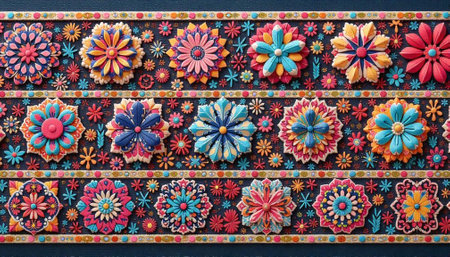 Colorful geometric embroidery pattern with intricate stitching and textile art design. That the image is generated using AI.