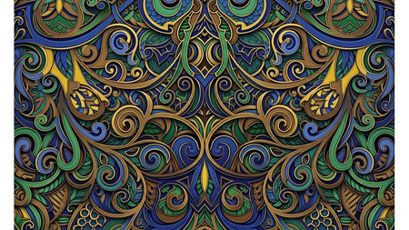 A detailed and ornate pattern featuring swirling floral motifs in gold, blue, and green, creating a rich and decorative background.