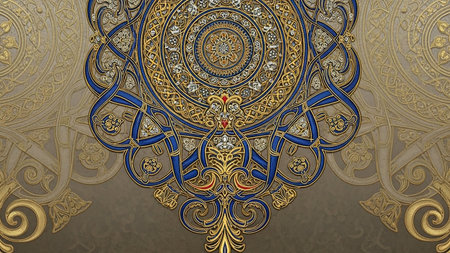 Close-up of a detailed Islamic tile pattern featuring gold, blue, and brown colors.