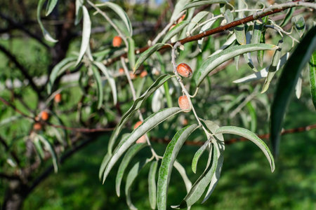 Branch of the tree Elaeagnus Angustifolia. Close-up of ripe berries of Russian olive. No people. Selective focus.