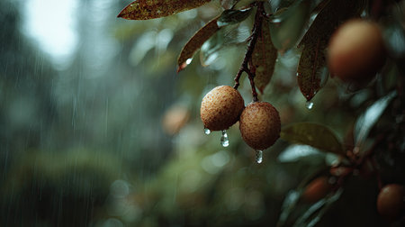 Soft rain falling gently on Longan, with water droplets forming and slowly dripping. The background is softly blurred with a natural, moody atmosphere.