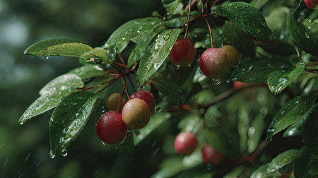 Miracle fruit in gentle light rain, soft raindrops visible on vivid green leaves, natural realistic style, bright fresh colors, balanced wide composition, cinematic framing, highly detailed.