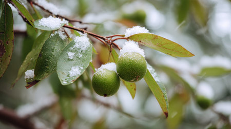 First snow falling gently on Hog plum, a few snowflakes drifting slowly and settling on the leaves; fresh air.