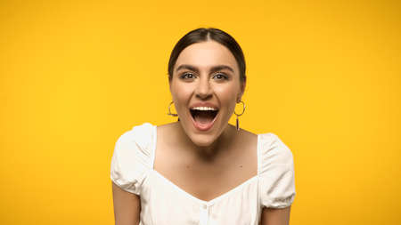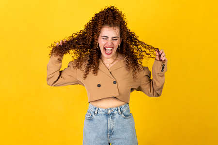 Curly girl in trendy outfit of jeans and jacket posing on the yellow background in the studio. Happy woman facial expression. Screaming and pulling hair.