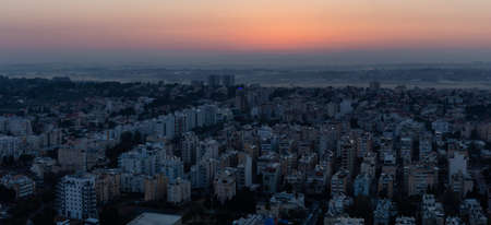 Aerial view of a residential neighborhood in a city during a vibrant and colorful sunrise. Taken in Netanya, Center District, Israel.