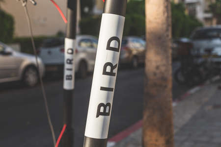 Tel Aviv/Israel-10/10/18: closeup of a logo on the Bird electric kick scooter. The bird is a micro-mobility company, operated shared electric scooters in over 100 cities all over the world