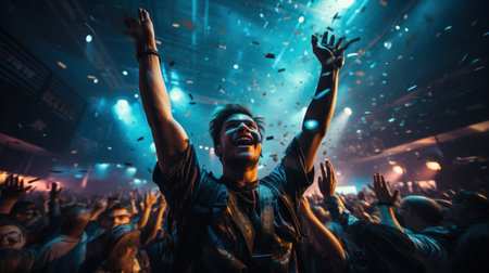 Person celebrating at a concert, confetti falling, vibrant lights