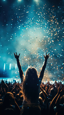Cheerful concert audience, hands up, confetti falling, bright stage lights