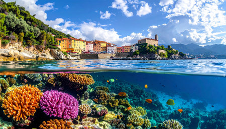 Beautiful underwater view of Ligurian sea and beautiful coral reef.
